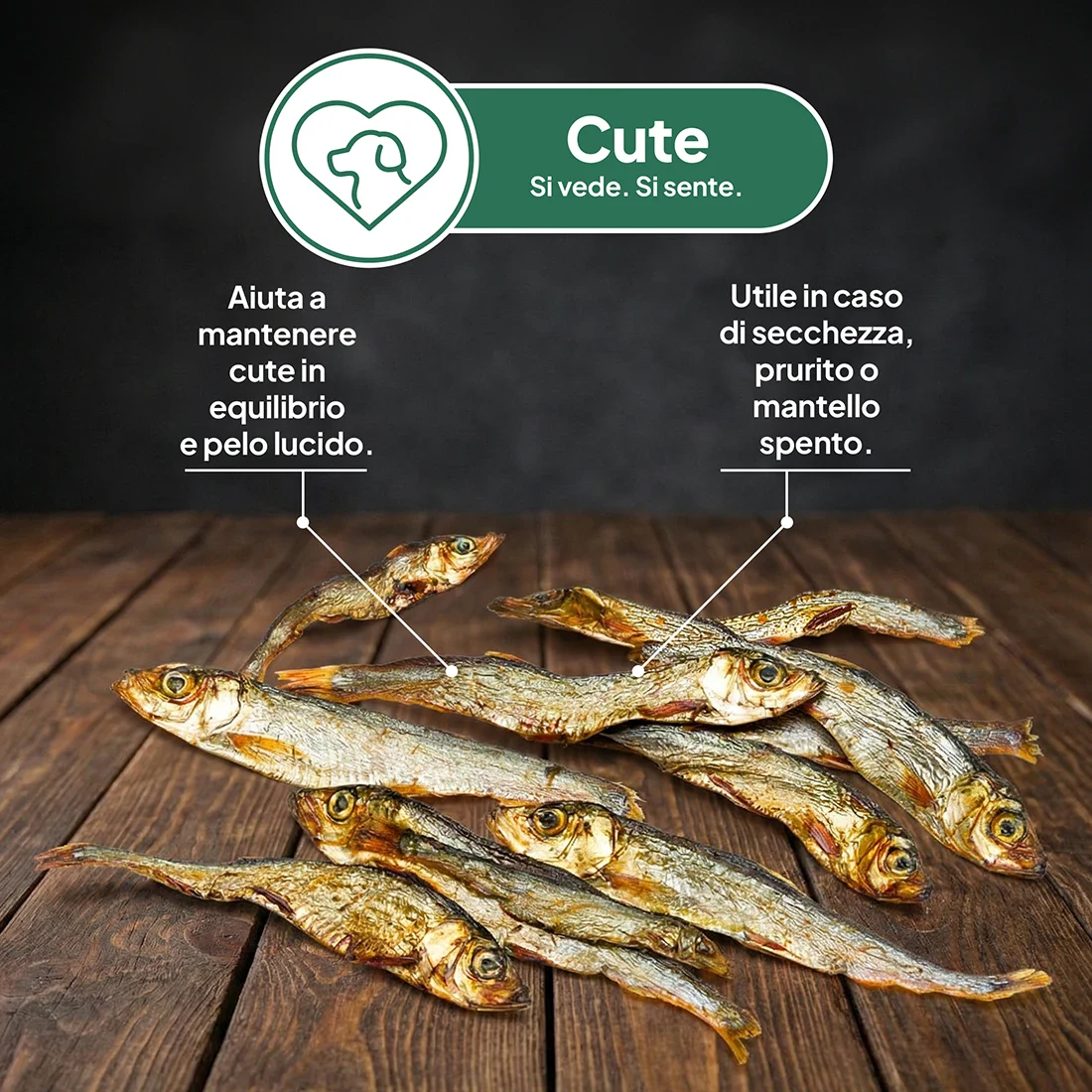 I pesciolini, aringhe intere, rappresentano una variante particolarmente sana nella dieta di cani e gatti. In particolare, sono fonte di numerose vitamine e diversi oligoelementi, tra cui acidi grassi Omega-3 e proteine animali nobili. Hanno un aroma molto intenso e una lunghezza di ca. 5/10 cm, tali dimensioni li rendono adatti anche a cani di piccola taglia e gatti.