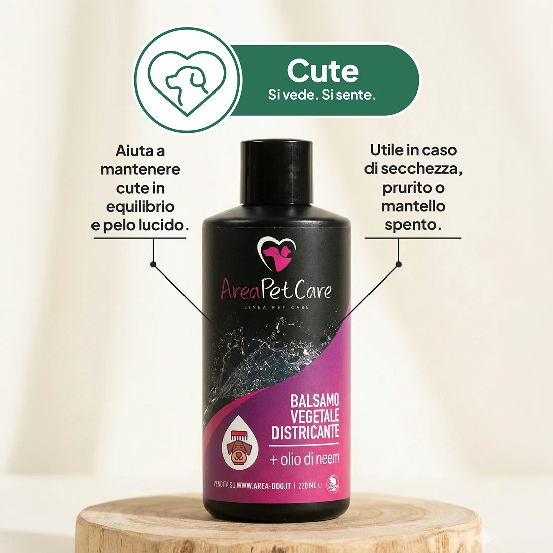 Il Balsamo con Olio di Neem ha una formulazione naturale arricchita all’Olio di Neem che rende la pelle più elastica e idratata. In particolare questa emulsione svolge un’azione lenitiva sui piccoli arrossamenti. Ad esempio, previene la formazione di nodi e rinforza la struttura cheratinica del pelo rendendolo forte, lucente e morbido.