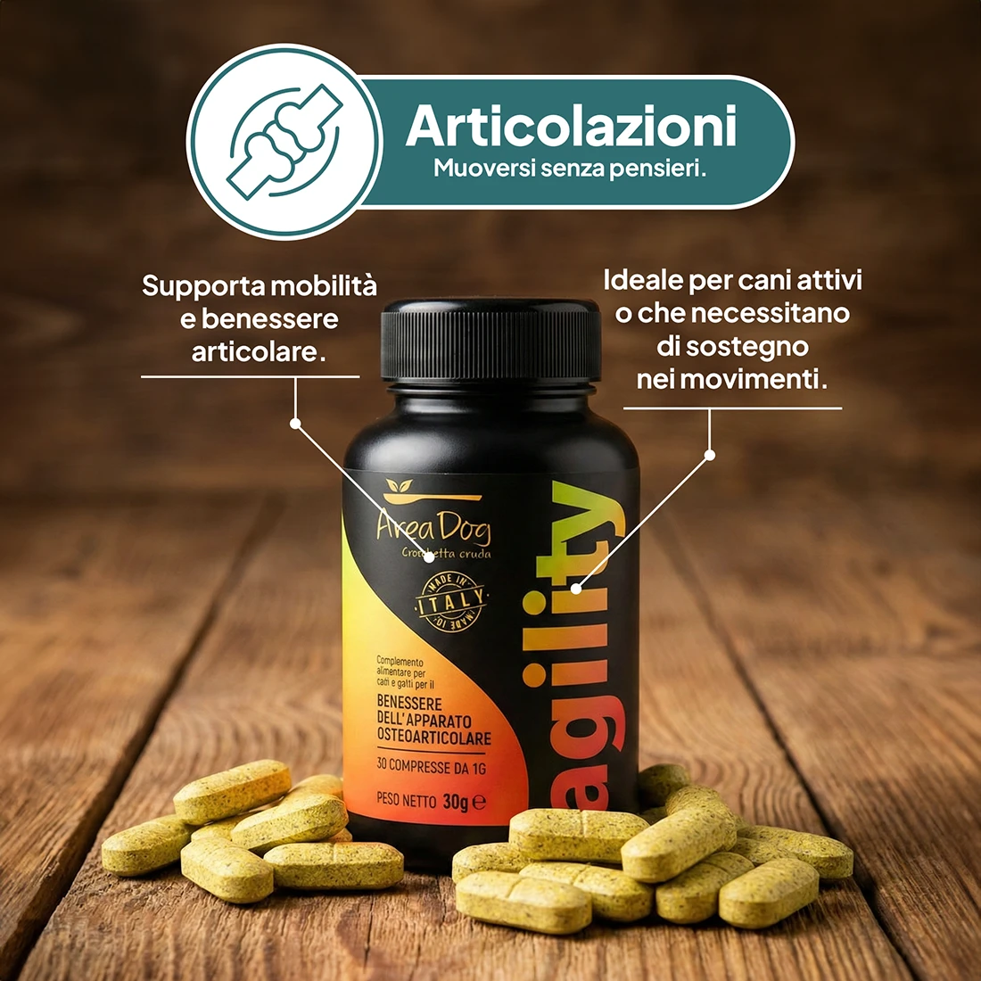 Le compresse Agility Area-Dog sono un complemento alimentare che contiene sostanze utili al mantenimento del fisiologico benessere dell’apparato osteo-articolare e risulta particolarmente utile nei periodi di crescita e di maggiore attività. Le compresse sono molto appetibili e possono essere date direttamente all’animale o miscelate nell’alimento abituale. Inoltre, sono facili da spezzare o ridurre in polvere per aggiungerle comodamente ai pasti. Sono un alimento ipoallergenico in cui: