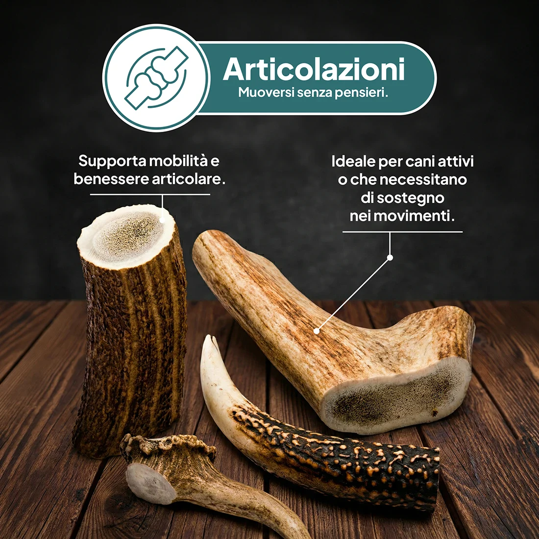 Le Corna di Cervo sono buona fonte di proteine. Soprattutto di cheratina (la proteina della pelle), sali minerali e calcio. I masticativi Area-Dog sono unici perché, a differenza di altri similari, hanno una freschezza caratteristica e di un’alta appetibilità. Soprattutto garantendo durezza inalterata e capacità di non scheggiare. In particolare, i Cervi, a ogni stagione, perdono naturalmente i loro palchi, basta semplicemente raccoglierli, pulirli e tagliarli. Le Corna di Cervo, soddisfano il palato di tutti i cani, da quelli più esperti ai principianti, dalle piccole taglie ai molossi.