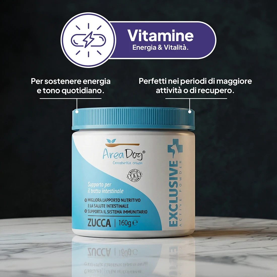 Exclusive a base di Zucca è un complemento alimentare 100% naturale, privo di conservanti o appetizzanti. Il suo mix di ingredienti ricercati è selezionato per favorire il benessere del tratto intestinale ed evitare la nascita di sensibilità.