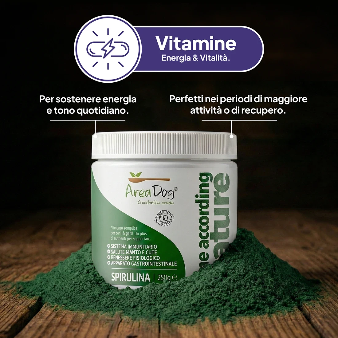 La polvere di Alga Spirulina Area-Dog è un complemento alimentare formato da un unico ingrediente 100% naturale. Al suo interno racchiude nutrienti fondamentali per la salute dell’organismo. Troviamo 18 tipi diversi di amminoacidi, un ottimo quantitativo di beta-carotene e diverse vitamine e sali minerali. È uno degli alimenti più ricchi disponibili in natura. Oltre ad avere un’azione disintossicante e antiossidante, agisce sull’organismo sotto diversi aspetti: