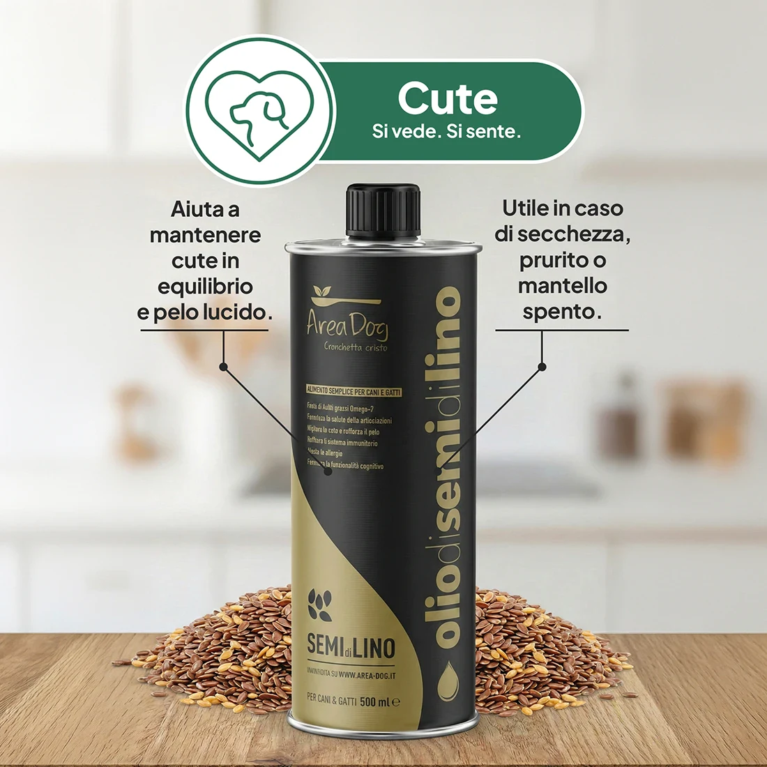 L’Olio di Semi di Lino Area-Dog è una fonte naturale di acidi grassi Omega-3 e di Omega-6. Si spreme, delicatamente, a freddo per preservarne al meglio i nutrimenti. In modo da risultare un’ottima fonte di energia altamente digeribile. È la scelta ideale in caso di animale con allergie o sensibilità. In particolare, l’Olio di Semi di Lino utilizzato ogni giorno: